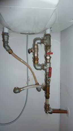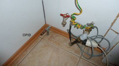 Loka fyrir kaldavatnið inn í húsið. Undir hitakúti í horninu er krani. Myndin sýnir þegar lokað er fyrir kranann og vatn rennur ekki inní sumarbústaðinn.