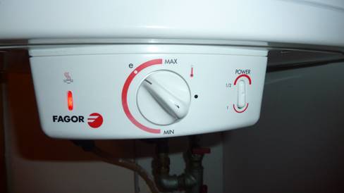 Stillingar á hitakútnum. "e" er venjuleg stilling og power "1"